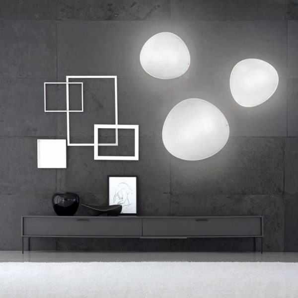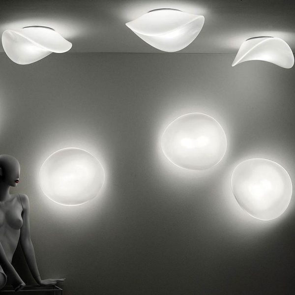 Vistosi Balance lampada da parete o soffitto in vetro lucido bianco, una forma elegante adatta in qualsiasi ambiente domestico; disponibile anche in altre due dimensioni e nella versione a sospensione.
