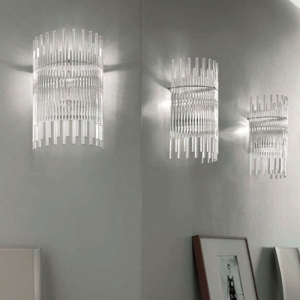 Vistosi Diadema lampada da parete con struttura cromata e diffusore in canne di vetro lavorato a mano nel colore trasparente.