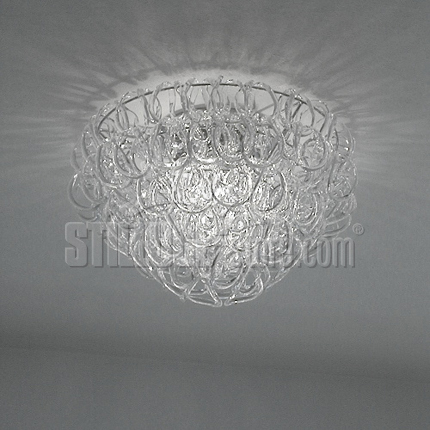 Vistosi Minigiogali lampada a soffitto d. 50 cm. Angelo Mangiarotti design. La versione ridotta di Giogali, che permette di impiegare i ganci in cristallo per installazioni a parete di minori dimensioni, standard o su misura. Collezione di lampade composte da elementi in cristallo interamente realizzati a mano e componibili a piacere. Tonalità del vetro: cristallo, 200 ganci. Parti metalliche: cromo. Codice prodotto: MINIGIOGALIPL50E27