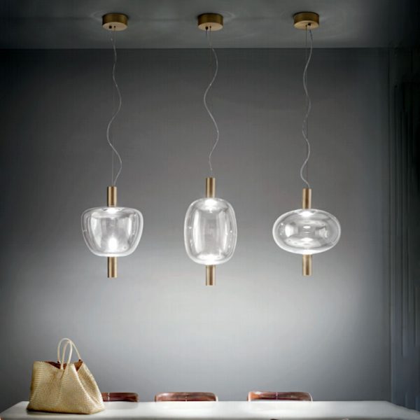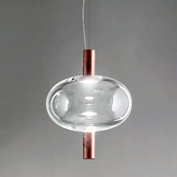 Vistosi Riflesso Sospensione SP1 LED; design Chiaramonte e Marin -2019. Come una bolla di sapone, la leggerezza e la semplicità del vetro che diventa protagonista in questa forma sinuosa arricchita dalla tonalità del vetro ambra o cristallo trasparente. La montatura metallica è con finitura nel colore oro o rame satinato. La sorgente luminosa led 12,5W attraversa la bolla di vetro per rinfrangersi su uno specchio in un gioco di rimbalzi; il vetro quasi invisibile fa da tramite tra la luce led e l’elemento riflettente. La Collezione è arricchita da altre due forme sia nel modello da tavolo che sospensione. Codice prodotto: RIFLESSO SP1