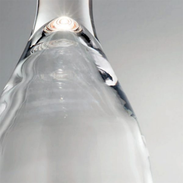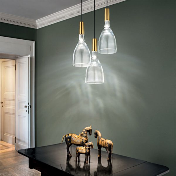 Vistosi Scintilla lampada a sospensione LED; design Giovanni Barbato 2019. Sospensione dalla forma classica senza tempo, la forma della luce che prende vita nelle trasparenze del cristallo accompagnato armoniosamente con il rame, il bronzo e l’oro lucido della montatura. La sorgente LED integrata (12W 1600lm. luce calda 3000K) accende il cristallo creando giochi di luce grazie al fondo pieno del bicchiere di vetro.