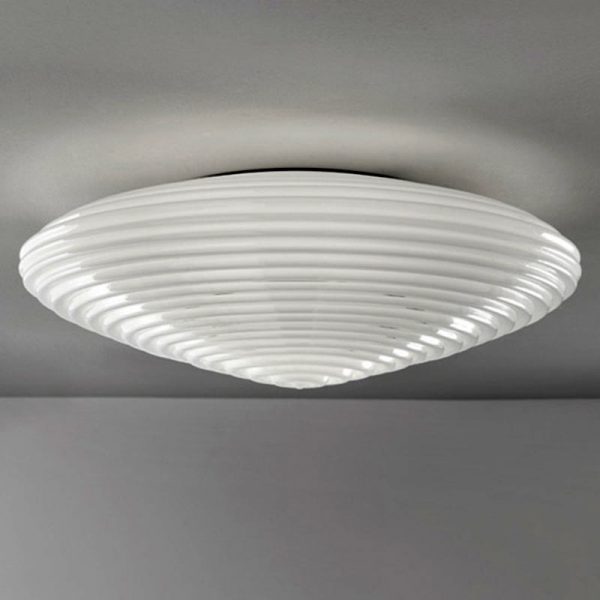 Vistosi Spirit lampada da parete o soffitto d. 45 cm. Struttura bianca con diffusore in bianco lucido. Diffusore caratterizzato da molteplici rigature che catturano e riflettono la luce.