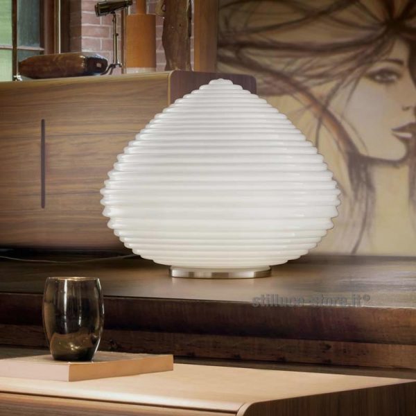 Vistosi Spirit lampada da tavolo d. 37 cm, design di Marco Acerbis, 2013. Struttura in nichel satinato e diffusore in vetro bianco lucido o cristallo trasparente. La forma del diamante scolpita nel vetro. Spirit è caratterizzata dalla presenza di rigature sul diffusore, frutto di una lunga ricerca, che catturano e riflettono la luce, nascondendo la sorgente luminosa. Lampadina attacco E27 per alogena eco o LED. Un diamante elegante che regala emozioni e riflessi accattivanti. Codice prodotto SPIRIT LT 37 E27